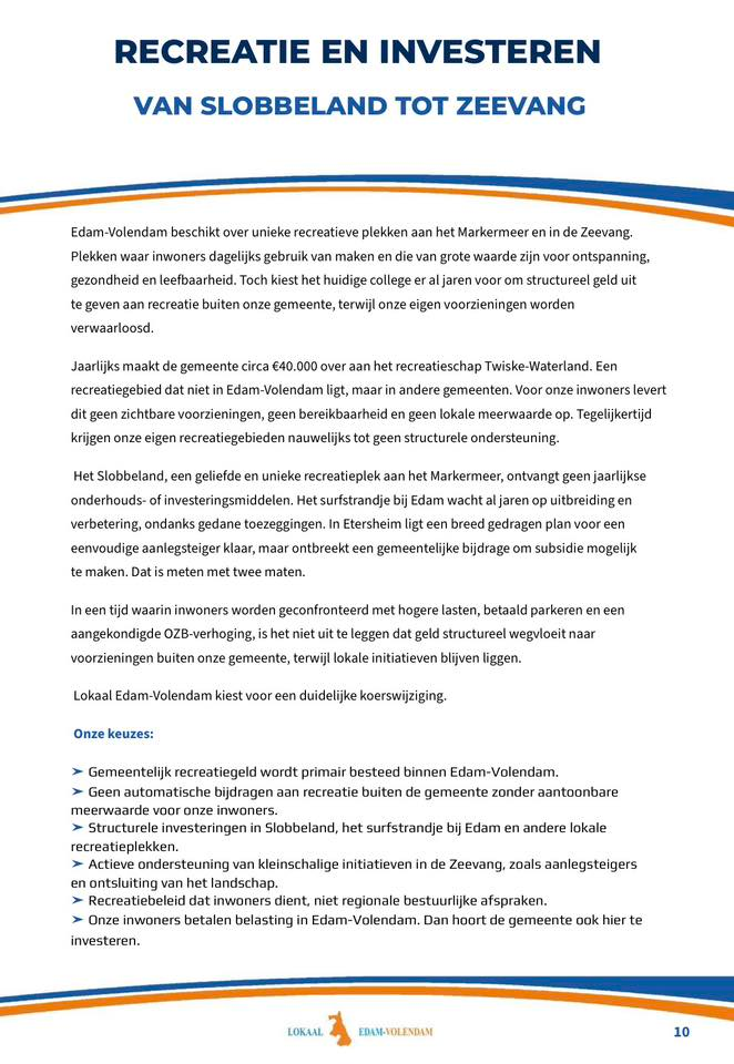 In ons verkiezingsprogramma hebben wij daarom vastgelegd dat gemeentelijke recreatiemiddelen in de eerste plaats binnen Edam-Volendam moeten worden ingezet. Niet als afwijzing van regionale samenwerking, maar vanuit het principe dat inwoners eerst mogen zien wat hun bijdrage oplevert in hun eigen leefomgeving.